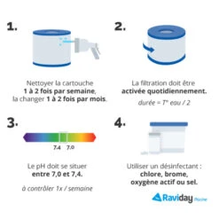 - 1 fois par semaine, testez le pH et le taux de désinfectant dans l’eau (taux de chlore ou taux de brome) avec des bandelettes test