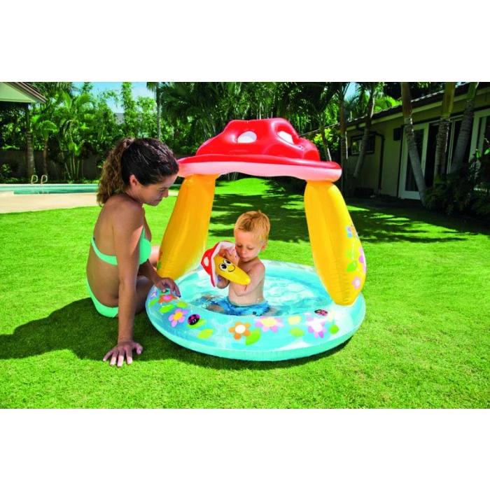 Craquez pour cette piscine champignon avec pare-soleil intégré, votre petit bébé se rafraîchir à l’abri des rayons du soleil et sera émerveillé par les couleurs et les formes de cette aire de jeu gonflable.